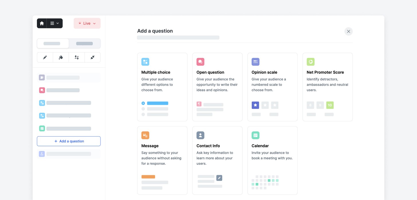 Open questions ask the user to provide their own non-structured answers. They’re ideal for gathering qualitative comments and opinions. These questions can be used to gather user suggestions or personal experiences, for example, by asking users for their opinions on what could be improved within the product.